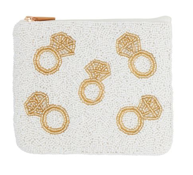 Lined cotton pouch with zipper closure features hand beaded exterior.