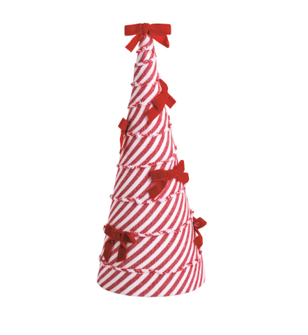 Create a whimsical and festive holiday display with our Bow Tree Sitters. These adorable tabletop cone trees are crafted from soft cotton and velvet and feature charming dimensional bows in classic red and white stripe patterns. Each tree offers a unique texture and shape, making them perfect for layered holiday vignettes.