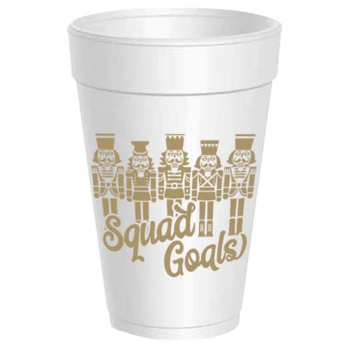 Sip in festive style with these Nutcracker Squad Goals Styrofoam Cups. Featuring a playful lineup of nutcrackers with “Squad Goals” in gold lettering, these 16 oz insulated cups are the perfect mix of fun and function for holiday gatherings.