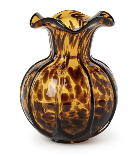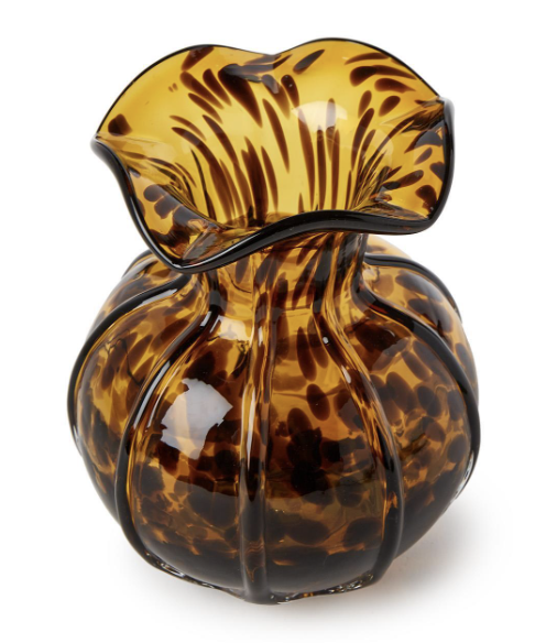 Bring warmth and texture to your home décor with the Ruffled Tortoise Vase. Crafted from amber glass with a tortoise shell-inspired pattern, this vase combines vintage charm with modern elegance. Its ruffled rim creates a striking silhouette, making it as much a piece of art as it is a functional vessel for flowers.