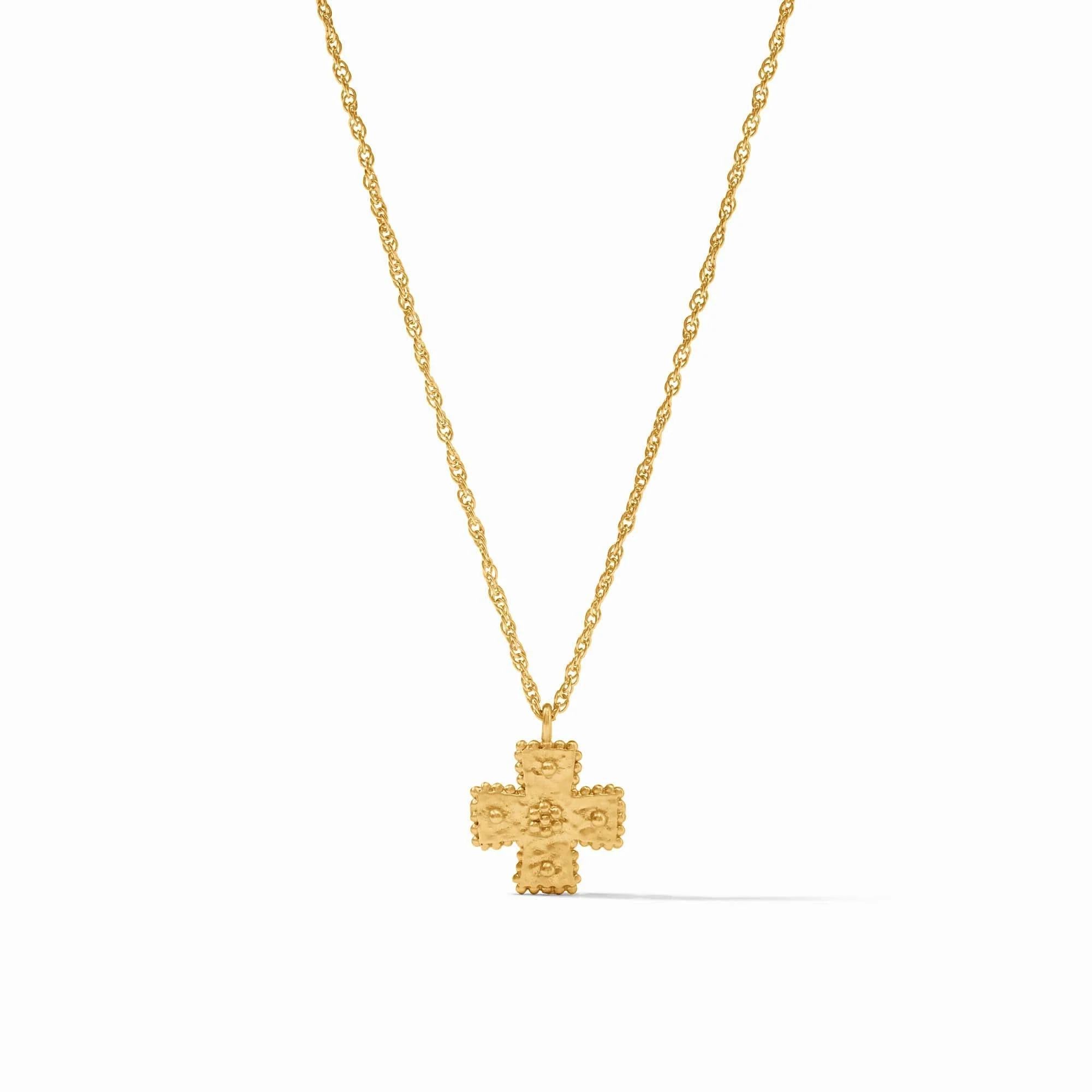 A hand-hammered cross pendant with golden bead accents and a shape which recalls early medieval crosses from England to Byzantium.