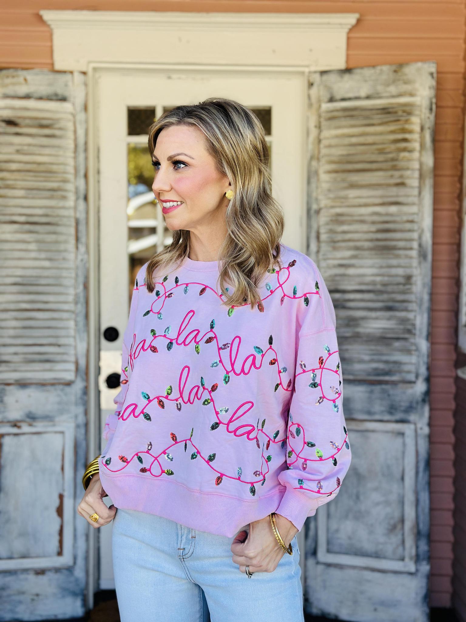 The Makenzie Embroidered Lights Sweater is the perfect pick for a cozy yet cheerful holiday look. Crafted from a soft pink fabric, this sweatshirt features intricately embroidered colorful Christmas lights and whimsical “fa la la la” script across the front and sleeves. Designed for comfort and style, it offers a relaxed fit, ribbed cuffs and hem, and just the right amount of stretch for all-day wear. Whether you’re decking the halls, baking cookies, or heading to a holiday party, this playful piece brings the spirit of the season wherever you go.