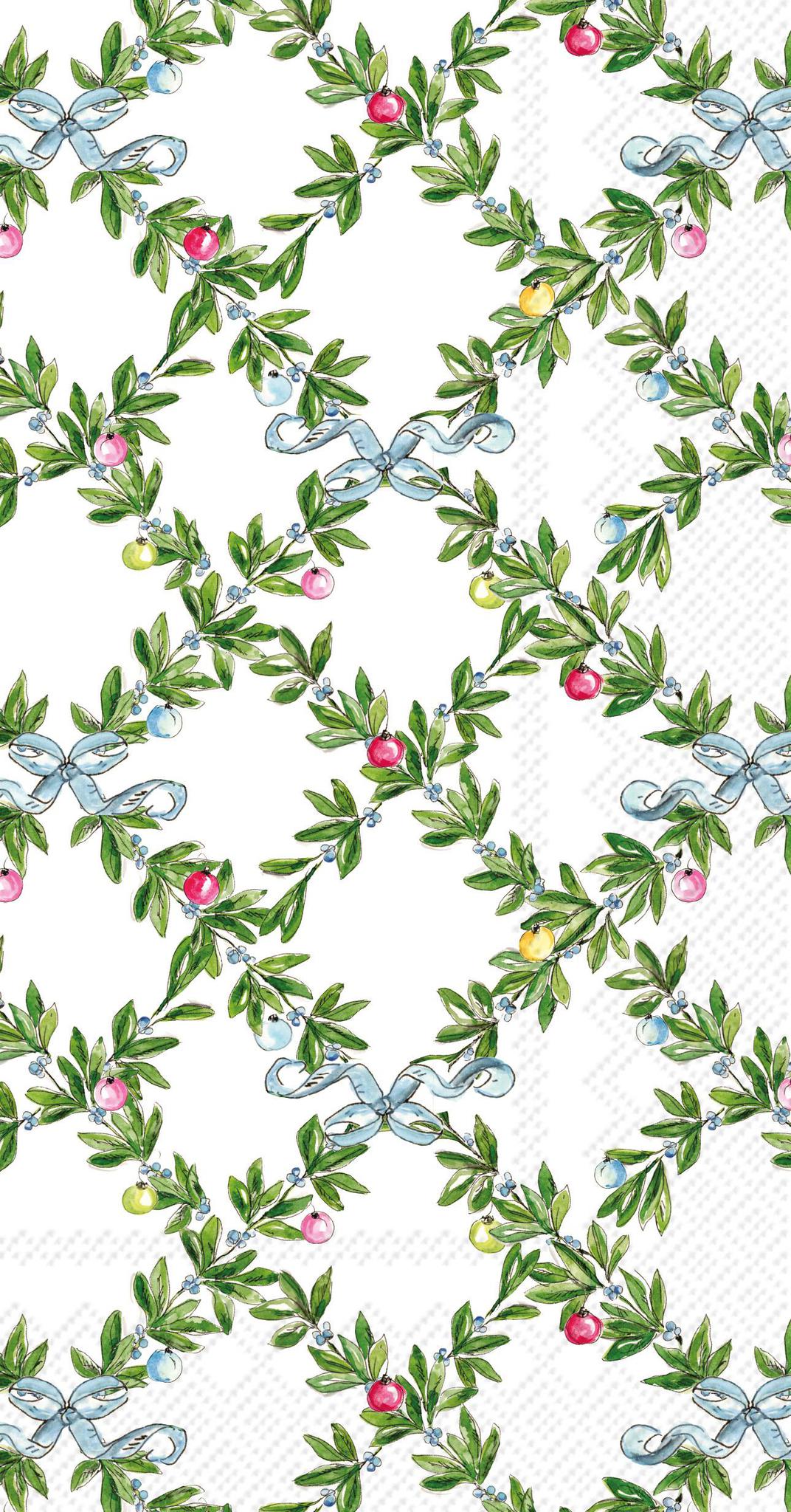 Elevate your holiday entertaining with the Boxwood Ornaments Guest Towels, featuring a timeless watercolor design of lush boxwood greenery, pastel ornaments, and elegant blue ribbons. Perfect for Christmas gatherings, these soft and absorbent disposable towels bring a fresh seasonal accent to your guest bath, kitchen, or buffet table.