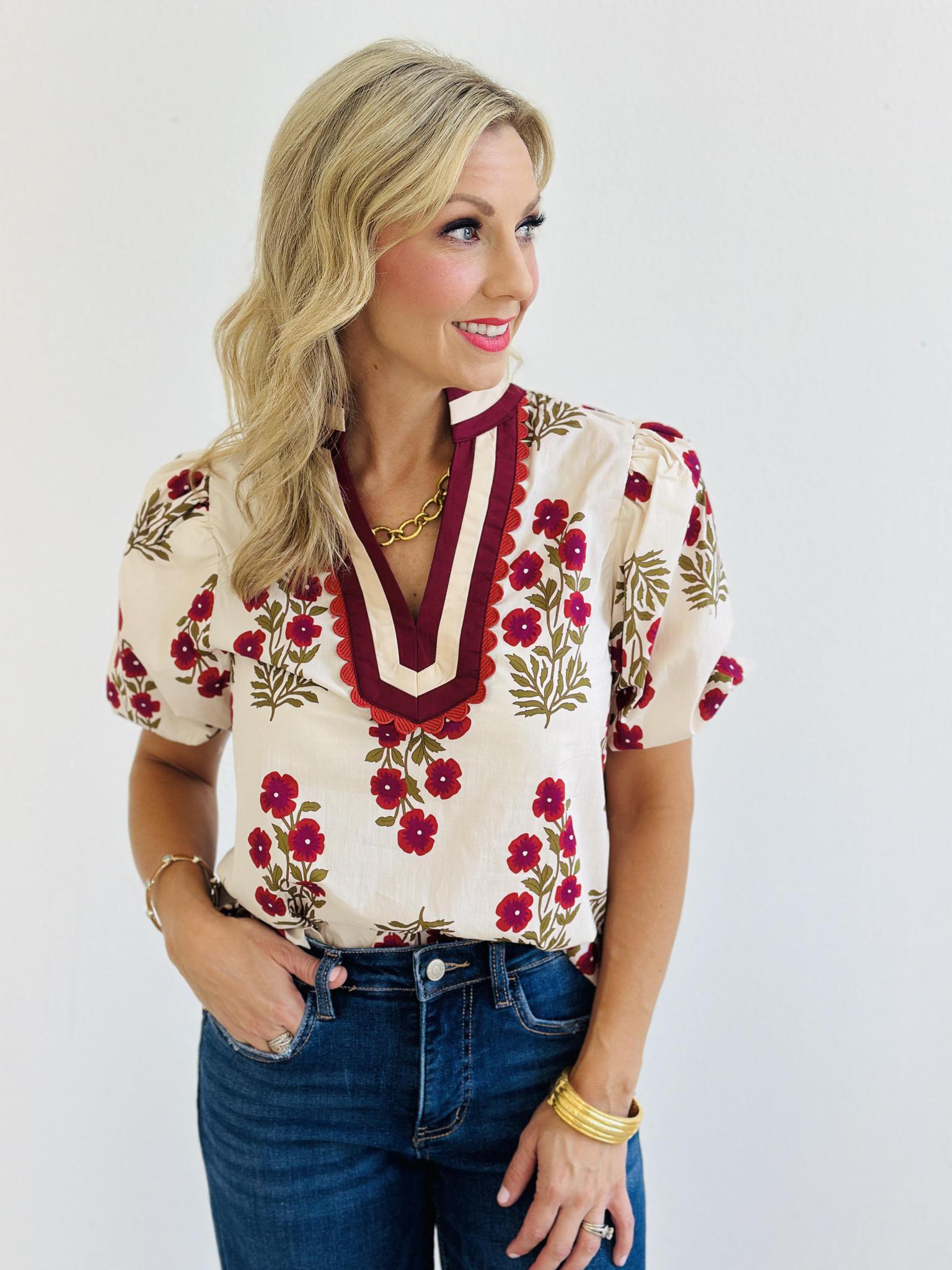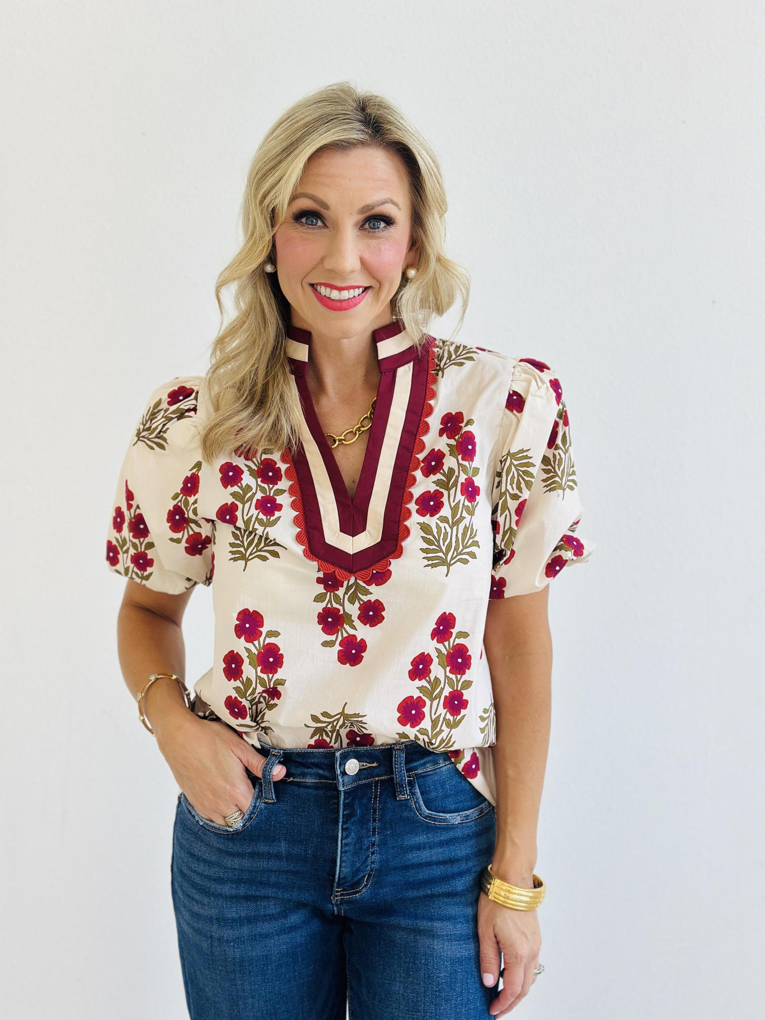 Erin Blouse – Floral Print Bubble Sleeve Top with Accent V-Neck Collar – Lindale Floral Shop