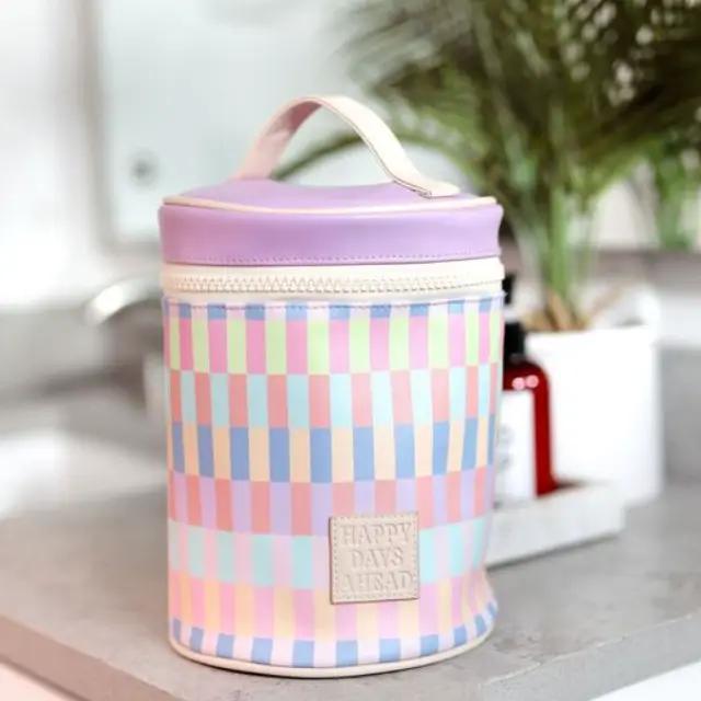 Brighten up your routine with the "Happy Days Ahead" Barrel Travel Bag! This cheerful and functional bag features a colorful pastel checkerboard pattern and a bold lavender top with a sturdy cream handle. The cylindrical shape and wide zip opening make it easy to store and access your beauty essentials, skincare, or toiletries—perfect for travel or keeping your vanity tidy. Crafted from wipeable material, it's as practical as it is playful. The patch on the front says it all: Happy Days Ahead!